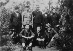 :: Pictured John Evans (in the hat) hides out in a Belgian wood in 1944 with fellow airmen and escaped Russian prisoners of war.